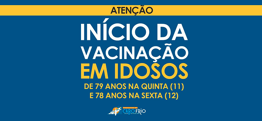A prefeitura de Cabo Frio vacina, nesta quinta-feira, idosos de 79 anos e na sexta os de 78 anos contra a COVID-19. A vacinação acontece em sistema drive-thru e nos polos, das 10 da manhã às três da tarde.