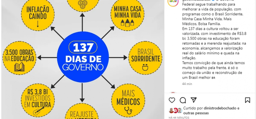 O texto da postagem afirmava: “O Governo segue trabalhando para melhorar a vida da população, com programas como o Brasil Sorridente, Mais Médicos, Bolsa Família, entre outras conquistas. Temos convicção de que ainda temos muito trabalho pela frente, é só o começo da união e reconstrução de um Brasil melhor”. A publicação foi compartilhada por outros perfis oficiais, como o da Secretaria de Comunicação e o do presidente da República.