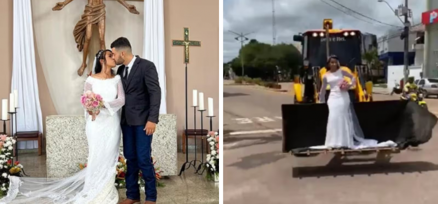 Durante o seu casamento ocorrido no último domingo, dia 9, uma noiva de Paragominas, no sudeste do Pará, resolveu surpreender o noivo e os convidados ao chegar sentada na “garra” de uma retroescavadeira, veículo pouco comum para celebrações desse tipo. A retroescavadeira é normalmente utilizada para escavações em construções e no ambiente agrário.